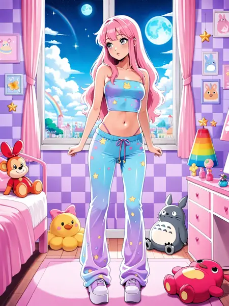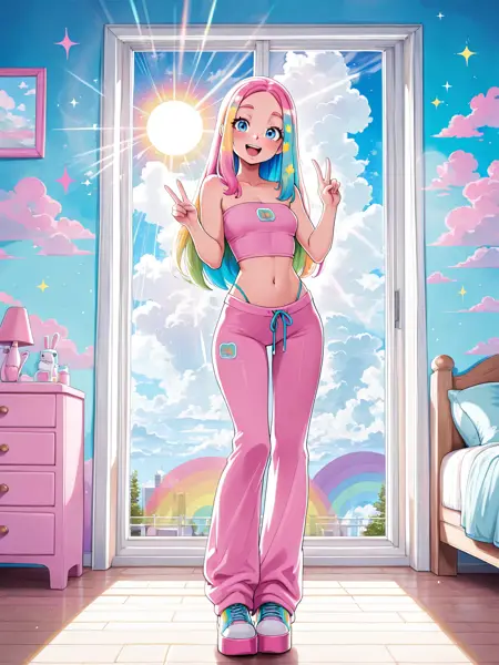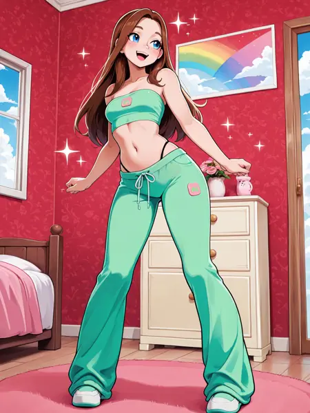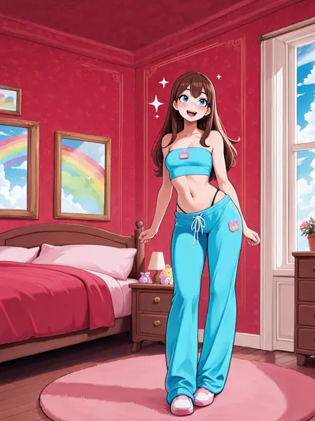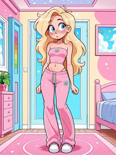 이 LoRA는 어깨가 드러난 튜브 탑과 스웨트 팬츠로 구성된 부드러운 Y2K 스웨트 세트를 특징으로 합니다. 캐주얼하면서도 세련된 실루엣을 유지하면서도 2000년대의 유쾌하고懷舊적인 스트리트웨어 분위기를 포착합니다. 디자인은 다양한 색상, 패턴, 프린트에 잘 일반화됩니다. 로고는 프롬프트에 따라 적응하며 때로는 재미있는 결과를 만들어내어 다양한 스타일에 유연하게 활용할 수 있습니다.