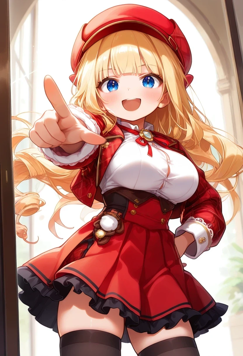red headwear,red skirt,black thighhighs,