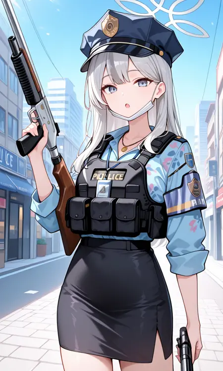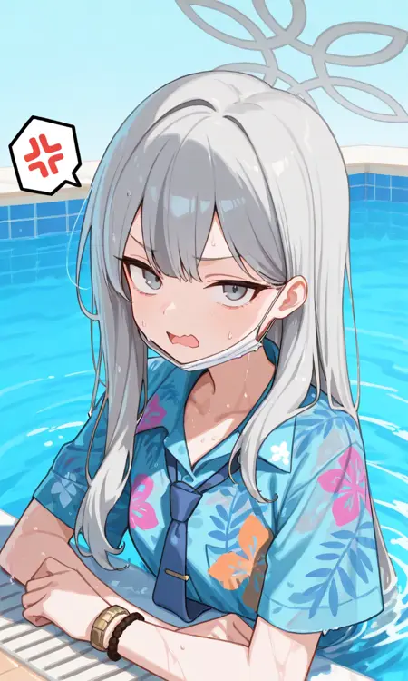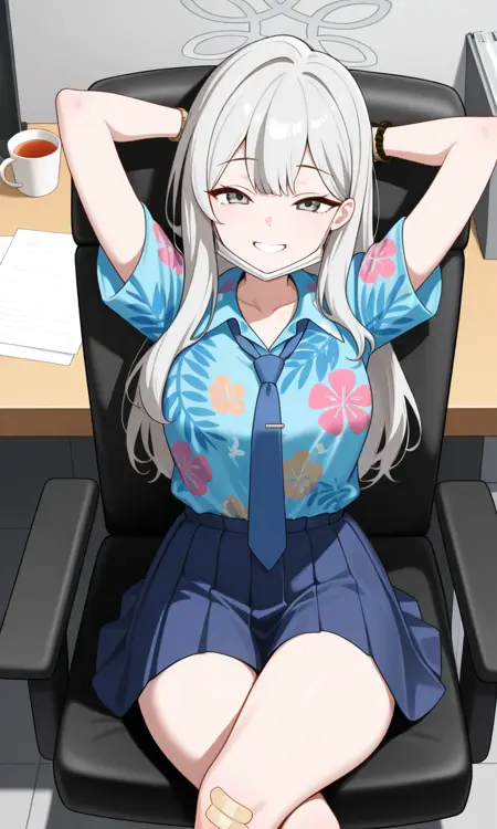 ba_konoka, long hair, surgical mask, mask pull, halo, blue shirt, hawaiian shirt, collared shirt, blue necktie, bracelet, black jacket, open jacket, blue skirt, pleated skirt, bandaid on kneeDefault outfit(No jacket) :