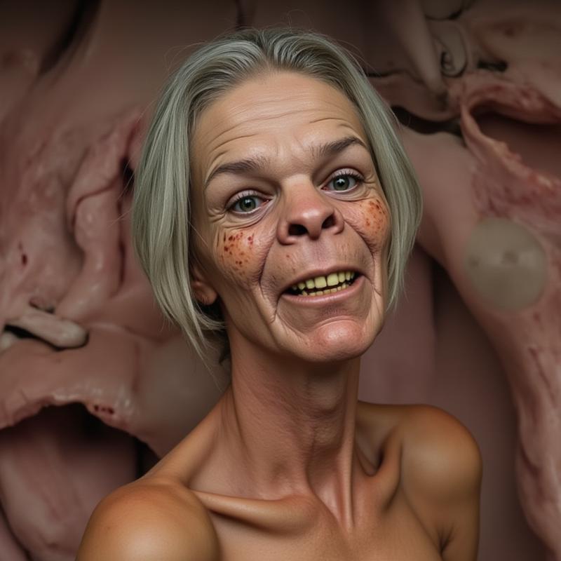 butwhy, a group of people standing around a giant hairy biped in a room with a flesh wall made of vaginas in the background. The people are wearing leotards and tight white turtlenecks, and the floor is visible at the bottom of the image. Everybody has silver pageboy haircuts. Uncanny valley.