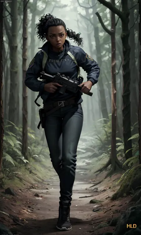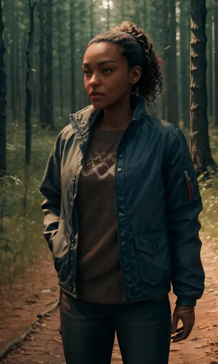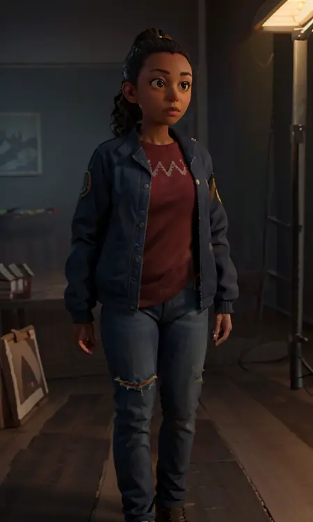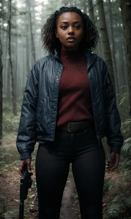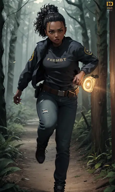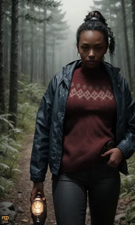 For outfit use, Coat, red knit sweater, FBI .You can also add bloody facebandage or bleeding, for her face as she does have an injured look as well.