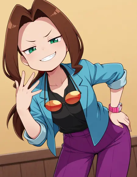 - medabotssamantha, 茶色の髪, 長い髪, 低いポニーテール, 長い分け目のある前髪, 髪の毛が顔にかかっている, 緑の目, 黒いシャツ, 青いジャケット, 紫のズボン, 首にサングラスをかけている, オレンジのサングラス