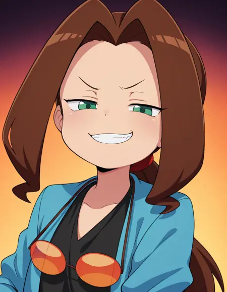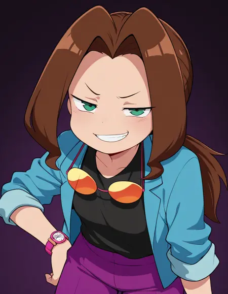 - medabotssamantha, brown hair, long hair, low ponytail, long parted bangs, hair intakes, green eyes, black shirt, blue jacket, purple pants, sunglasses around neck, orange sunglasses