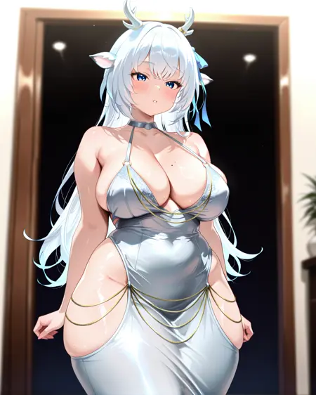 KakIori, blue eyes, long hair, white hair, antlers, white deer ears, blue ribbon, large breasts