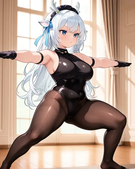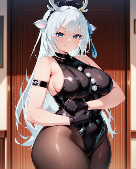 KakIori, blue eyes, long hair, white hair, antlers, white deer ears, blue ribbon, large breasts