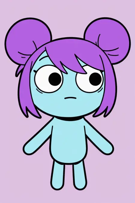 PibbyLWP, 1girl, cyan skin, big black eyes, purple hair with two large purple hair buns, short, chibi