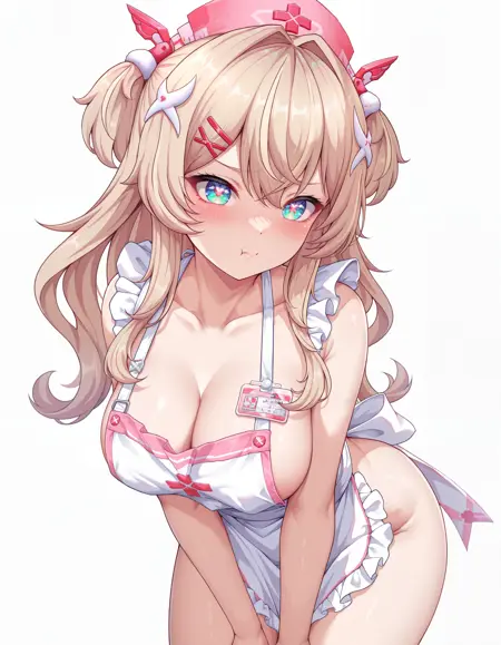 Lechesis,金发,蓝眼,异色瞳,心形瞳孔,长发,发色渐变,侧发,两侧上梳,发簪,发夹,X形发饰,官方护士帽,