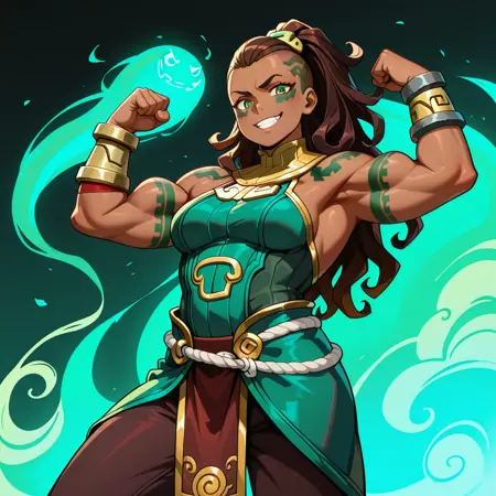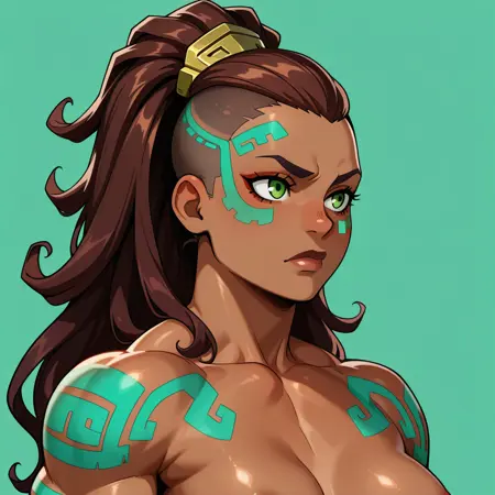 | トレーニングワード | lolillaoi, 1girl, solo, dark-skinned female, muscular female, medium breasts, tattoo, facial tattoo, long hair, hair pulled back, dreadlocks, brown hair, ponytail, green eyes, hair ornament, gold armor, bare shoulders, green dress, bracelet, pelvic curtain, belt rope, pantsコピーしました! |