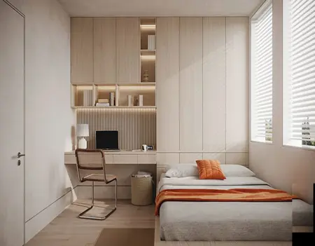 窓際のベッドと机がある小さな寝室、インテリアデザイン