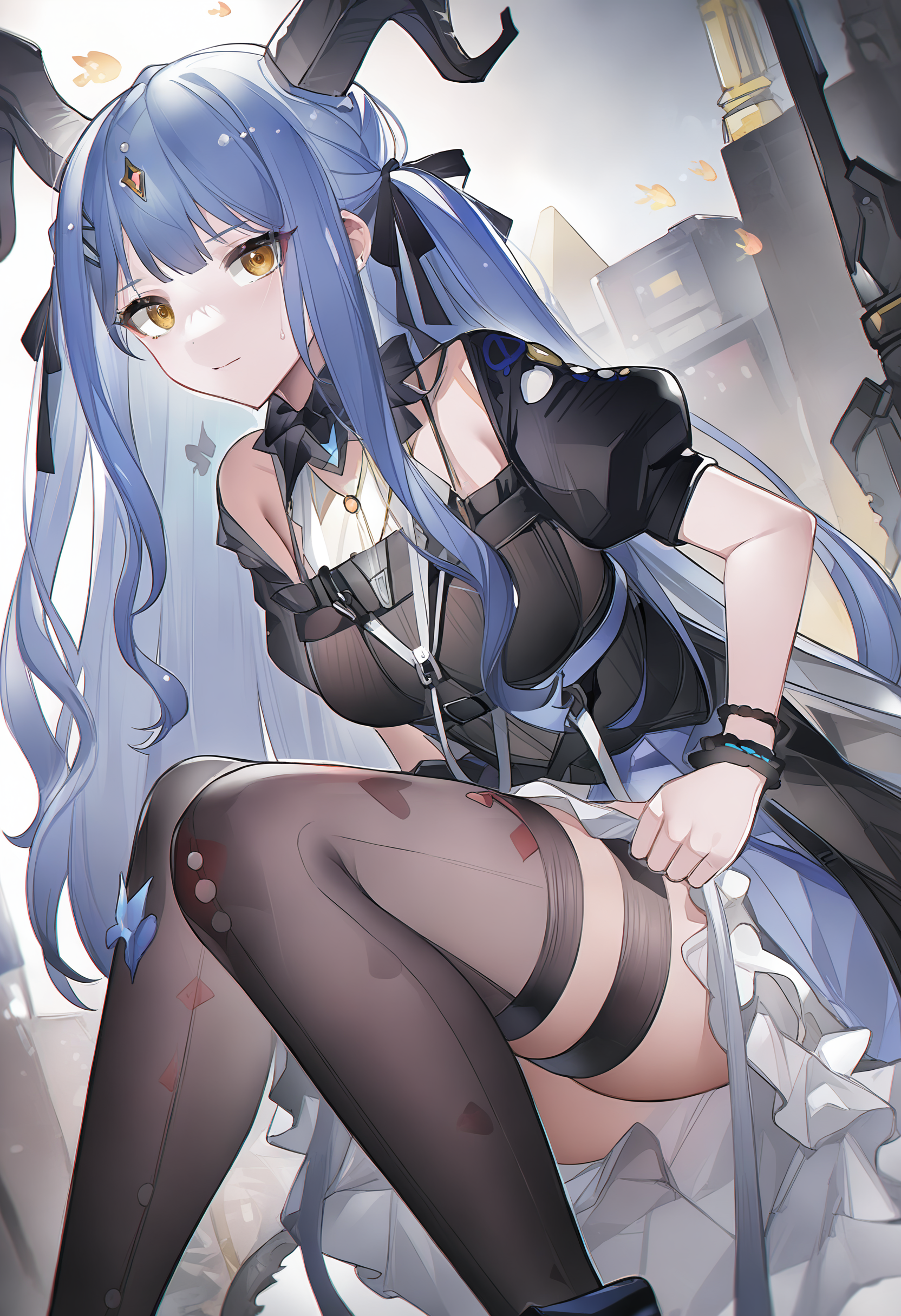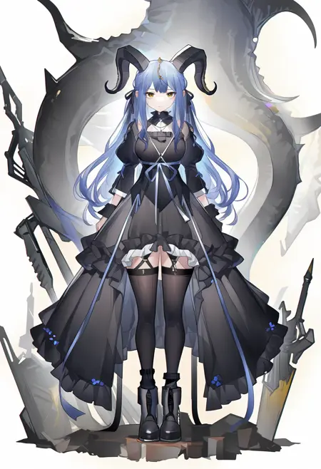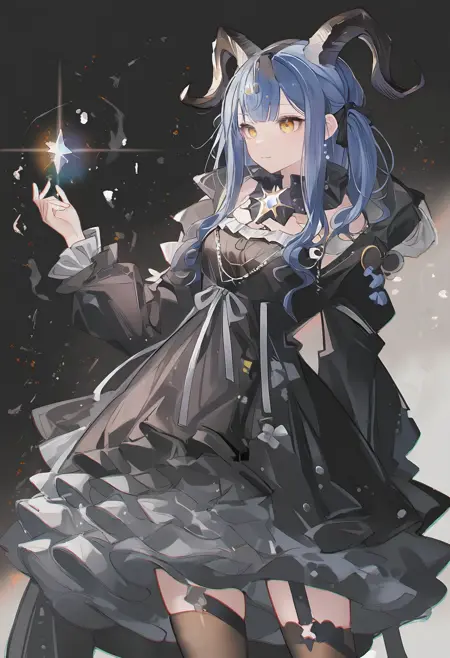 sakiko\(arknights\),togawa sakiko,1girl,solo,black dress,layered dress, goat horns, curled horns