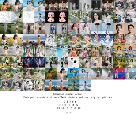 このワークフローは、多くの変換モデル(LoRA)のスタイルを統合しています。ローカルで使用すると若干面倒ですが、オンラインで体験することをお勧めします。ここには10以上ものLoRAモデルが含まれており、対応する番号を入力するだけで自動生成されます。