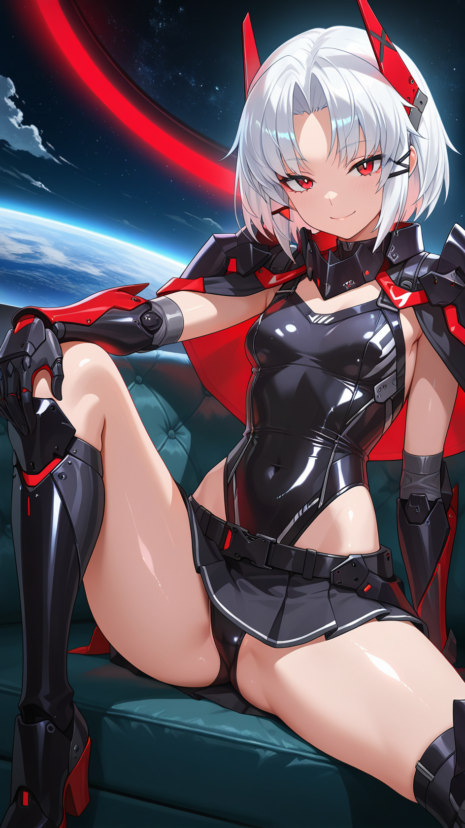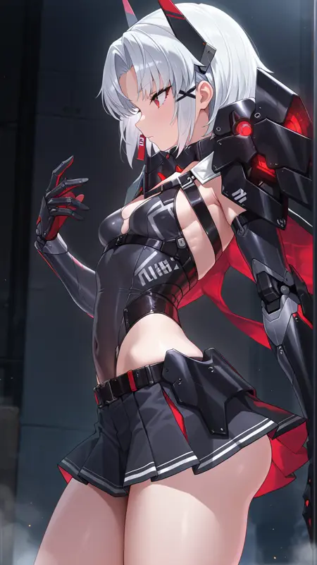 skirt, pleated skirt, belt, miniskirt, black skirt, armor, parted bangs, covered navel, headgear, shoulder armor, black leotard, highleg leotard, mechanical arms, cape, shoulder armor, hair ornament,