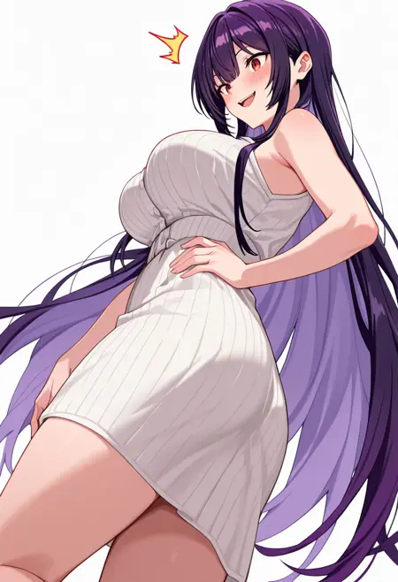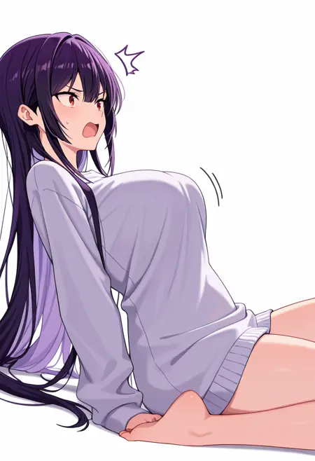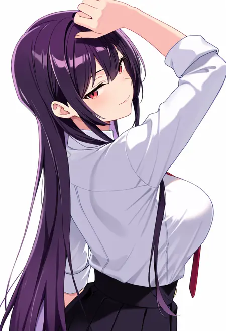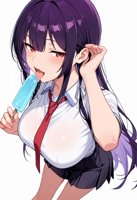 takane_cnr, 1girl, long hair, red eyes, purple hair, large breasts, sidelocks, black hair, very long hair,