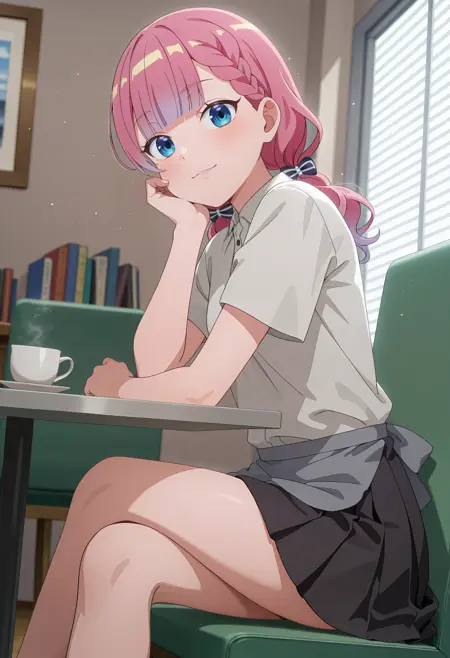 WatariMakina,蓝眼睛,粉发,长发,波浪发,侧边辫子,发饰蝴蝶结,齐刘海 —— 添加“低双马尾”以获得另一种发型