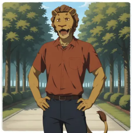 anthro, furry, lion, lion snout, lion ears, whiskers, yellow fur, multi-colored fur, lion tail, brown hair, brown eyes