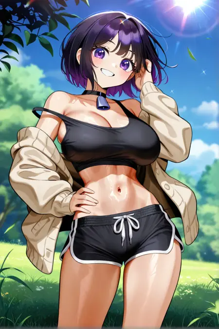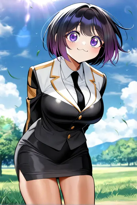 gooseul,black hair,purple hair,short hair,purple eyes,large breasts