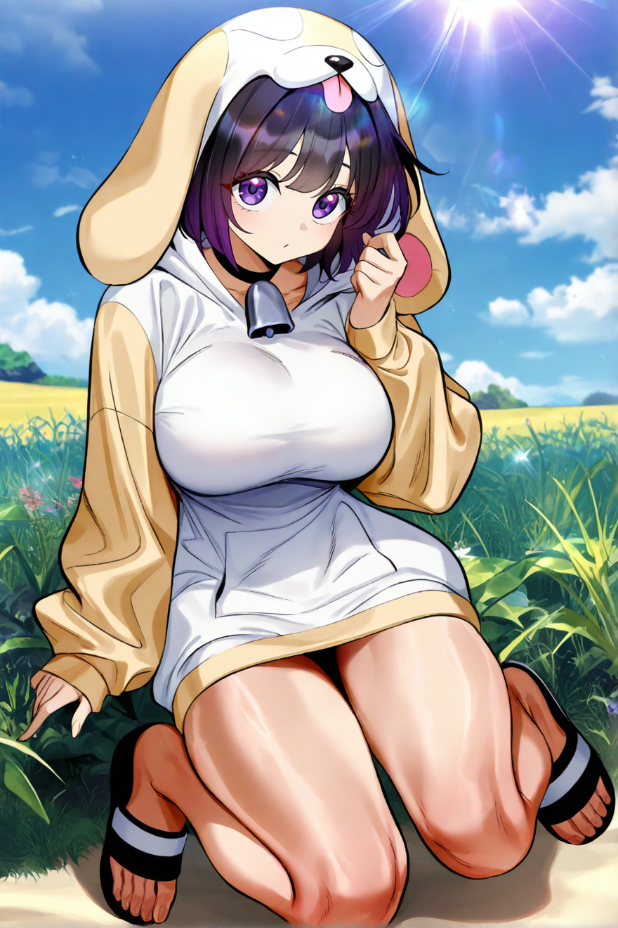 gooseul、黒髪、紫髪、ショートヘア、紫の目、大きな胸