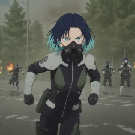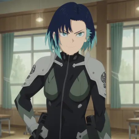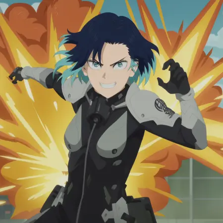 Trigger Words: Shinonome Rin, two-tone hair, short hair, bodysuit, shoulder pads,