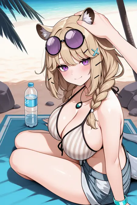 여름 꽃: 청록색 손톱, 두 개의 땋은 머리카락, 햇빛 모자, 짚 모자, 보라색 톤 안경, 목걸이, 펜던트, 갈색 코트, 긴 코트, 열린 코트, 넓은 소매, 어깨 노출, 세로 줄무늬 비키니, 앞쪽 매듭 비키니 상의, 이색 비키니, 갈색 비키니, 흰색 비키니, 데님 반바지, 파란색 반바지, 짧은 반바지, 청록색 팔찌