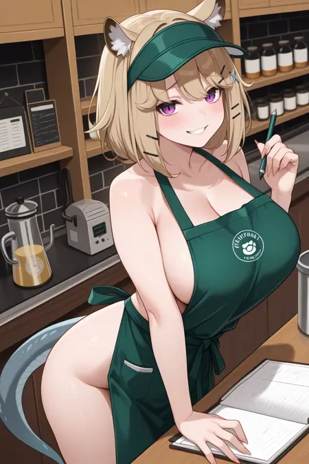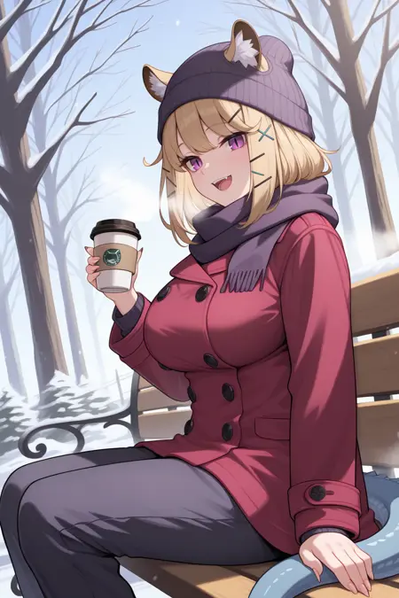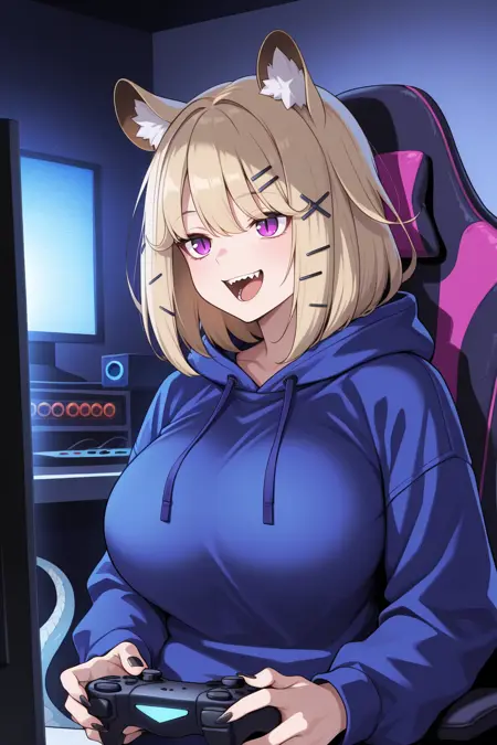 외모: ut4g3, 큰 가슴, 동물 귀, 동물 귀 털, 꼬리, 보라색 눈, 수직 동공, 금발 머리, 중간 길이 머리, 여러 개의 머리핀, x 머리 장신구, 날카로운 손톱