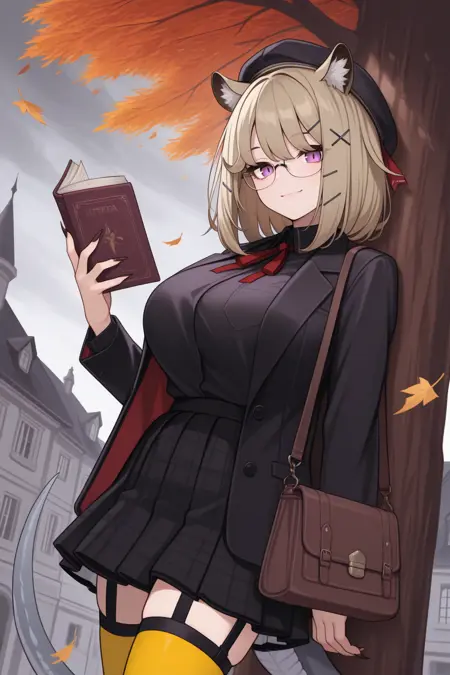 위장: 안경, 검은 베레모, 모자 리본, 빨간 리본, 검은 재킷, 열린 재킷, 빨간 목 리본, 검은 칼라 셔츠, 검은 치마, 주름 치마, 체크무늬 치마, 스타킹 끈, 노란색 허벅지 스타킹
