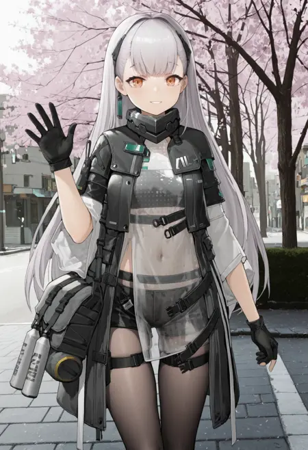 tlldef, headgear, medium breasts, long hair, white hair, orange eyes, white sleeves, black gloves, see-through clothes, black tube top, black shorts, black pantyhose, thigh strap, shoulder bag,