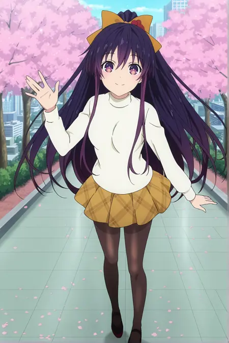 休闲款:tohka-ya,休闲,1girl,紫色眼睛,紫色头发,长发,马尾辫,橙色发带,毛衣,黄色裙子,百褶裙,丝袜,鞋子