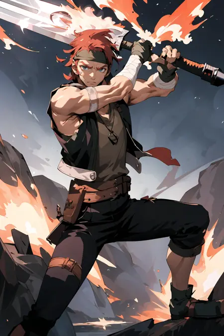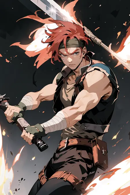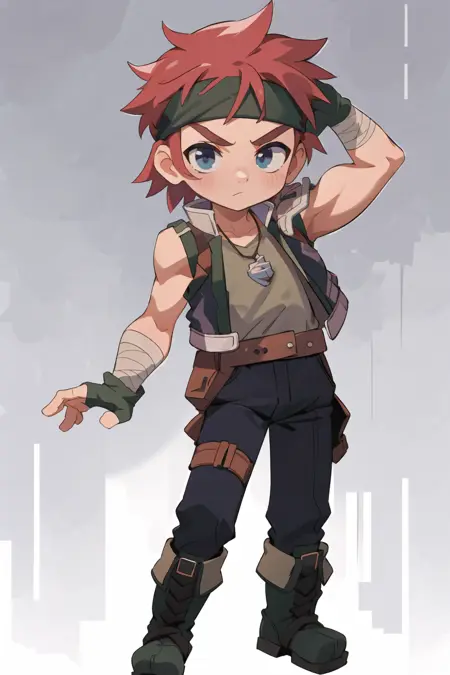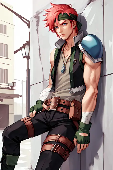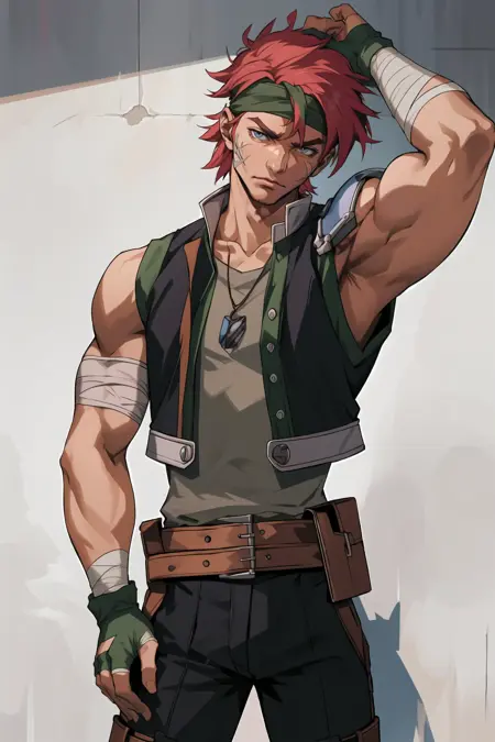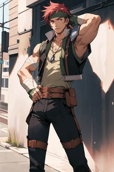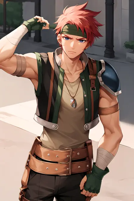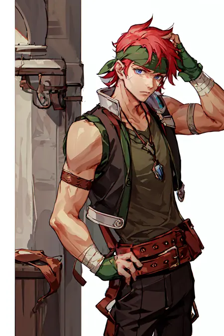 Trigger words (for upper body): agatesora, 1boy, head band, vest, shoulder armor, sleeveless shirt, necklace, bandages, fingerless gloves