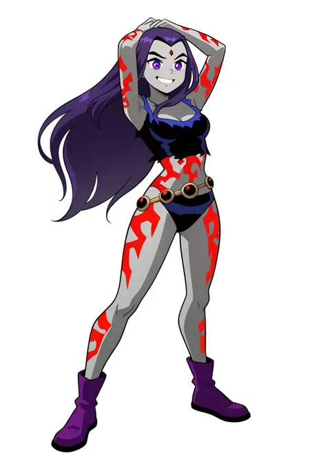 azaryrobin, 회색 피부, 보라색 머리, 단발머리, 도미노 마스크, 녹색 팬티, 녹색 투피스, 녹색 장갑, 노랑과 검은색 망토, 빨간 갑옷 조끼 안에 녹색 반소매 티셔츠, 빨간 조끼, 녹색 티셔츠, 조끼 안 티셔츠, 왼쪽 가슴에 노랑색 "R", 노랑색 유틸리티 벨트, 검은색 강철 앞굽 부츠,