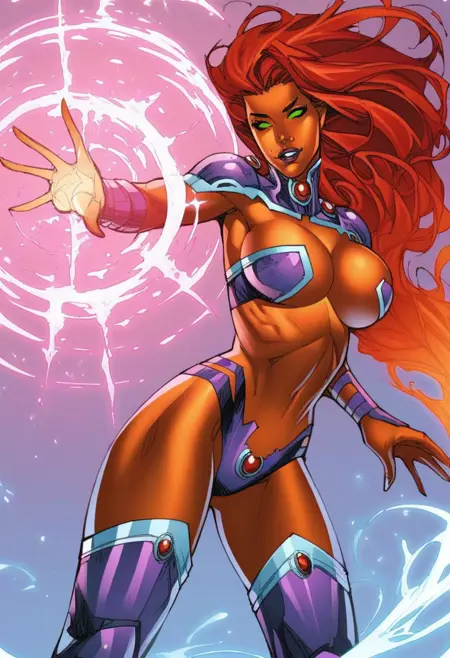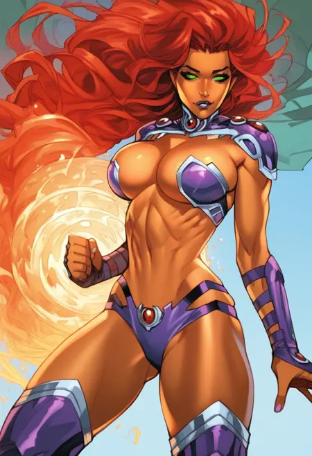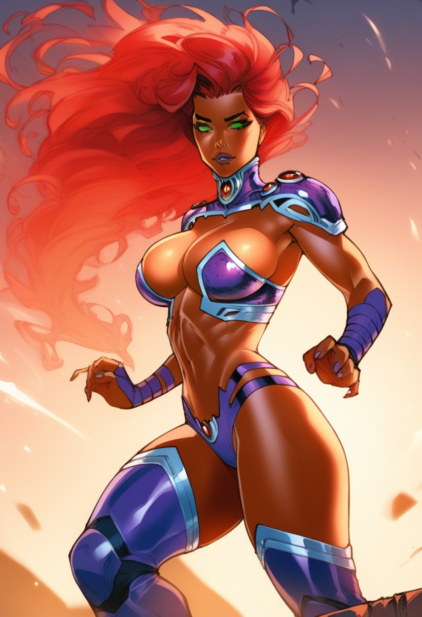トリガー: starfirecomic、赤髪の女性、長い髪、緑の目、大きな胸、肌の黒い女性、ビキニ、アーマー、太ももまでのソックス、バストイアー
