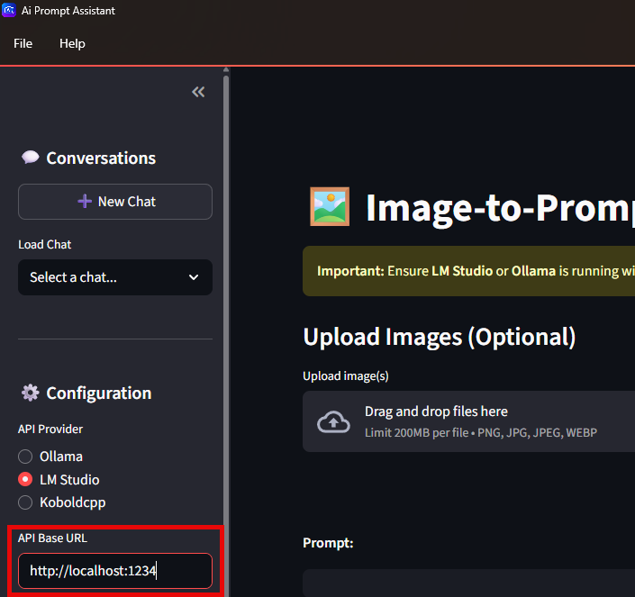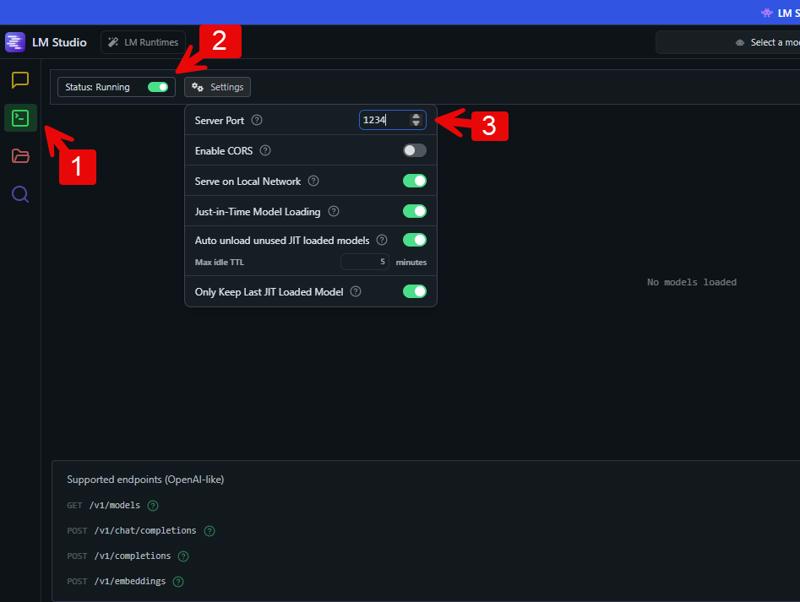 API 기본 URL 입력: “API Base URL” 필드에 http://localhost: 뒤에 LM Studio에서 설정한 포트 번호를 입력하세요. 예를 들어 포트 1234를 사용했다면 http://localhost:1234을 입력합니다. 이렇게 하면 애플리케이션이 LM Studio에서 실행 중인 모델과 상호작용할 주소를 알게 됩니다.