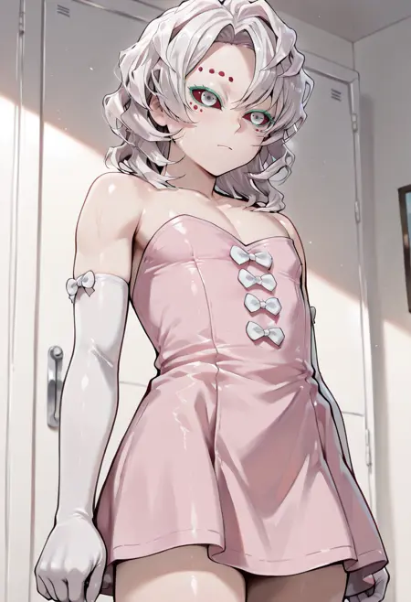 触发词:Rui、白发、白色巩膜、红色巩膜、白眼、虹膜上的点、浅绿色睫毛、浅绿色指甲油、无眉毛、面部彩绘、肌肉,