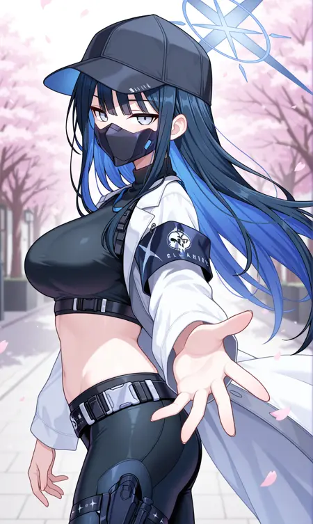 baseball cap, black cap, mouth mask, mask, black crop top, black pants, tight pants, belt, white coat, open clothes, long sleeves, armband