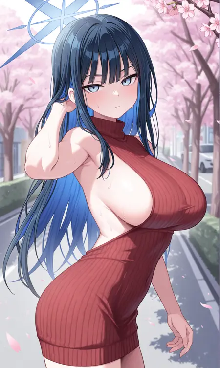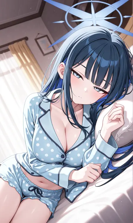 saori (blue archive), blue eyes, halo, multicolored hair, blue halo, long hair, colored inner hair,