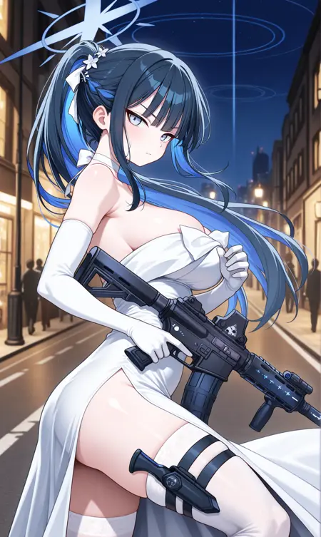 saori (blue archive), blue eyes, halo, multicolored hair, blue halo, long hair, colored inner hair, white dress, strapless dress, elbow gloves, white gloves, black bow, long dress, hair ornament, white choker
