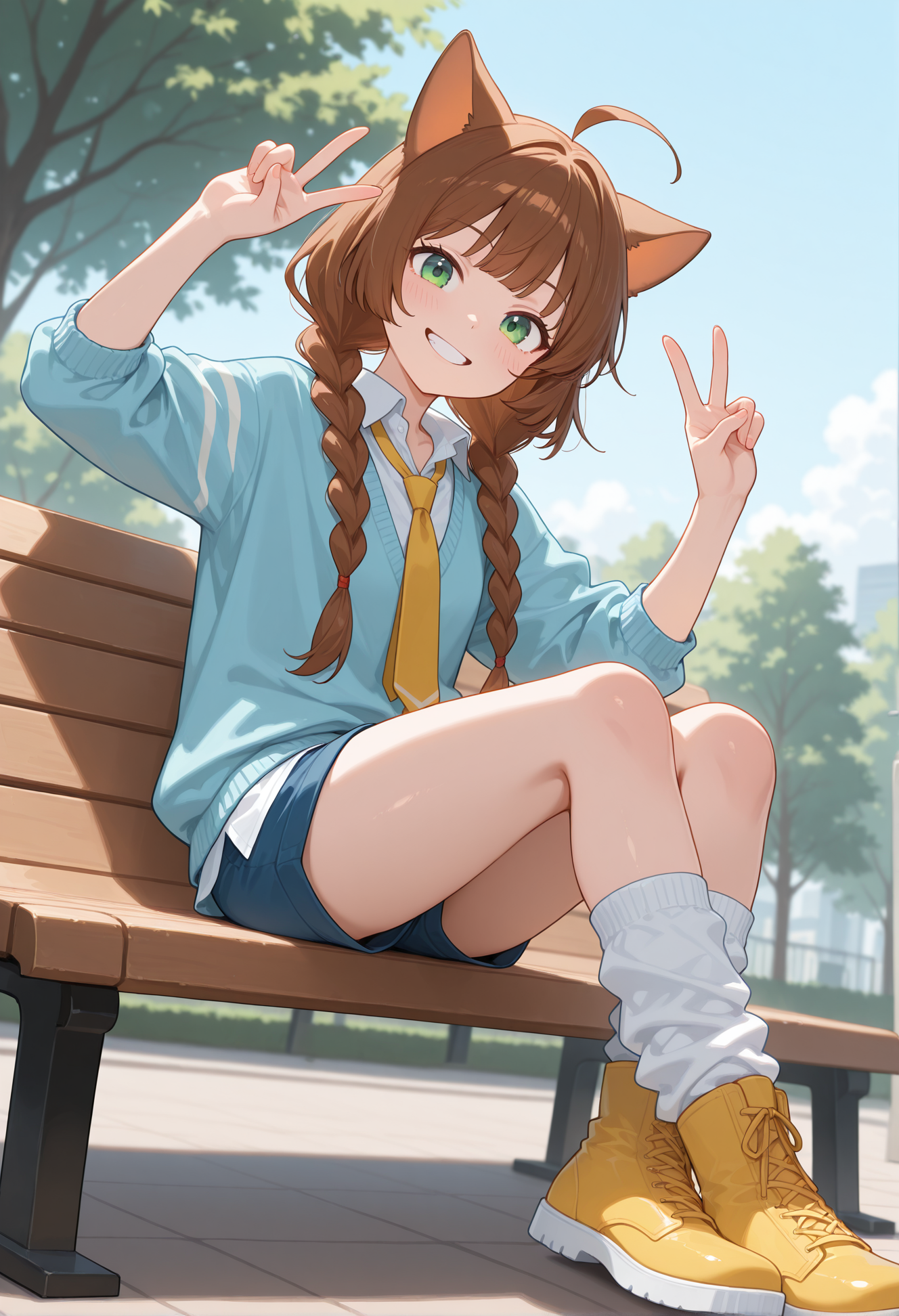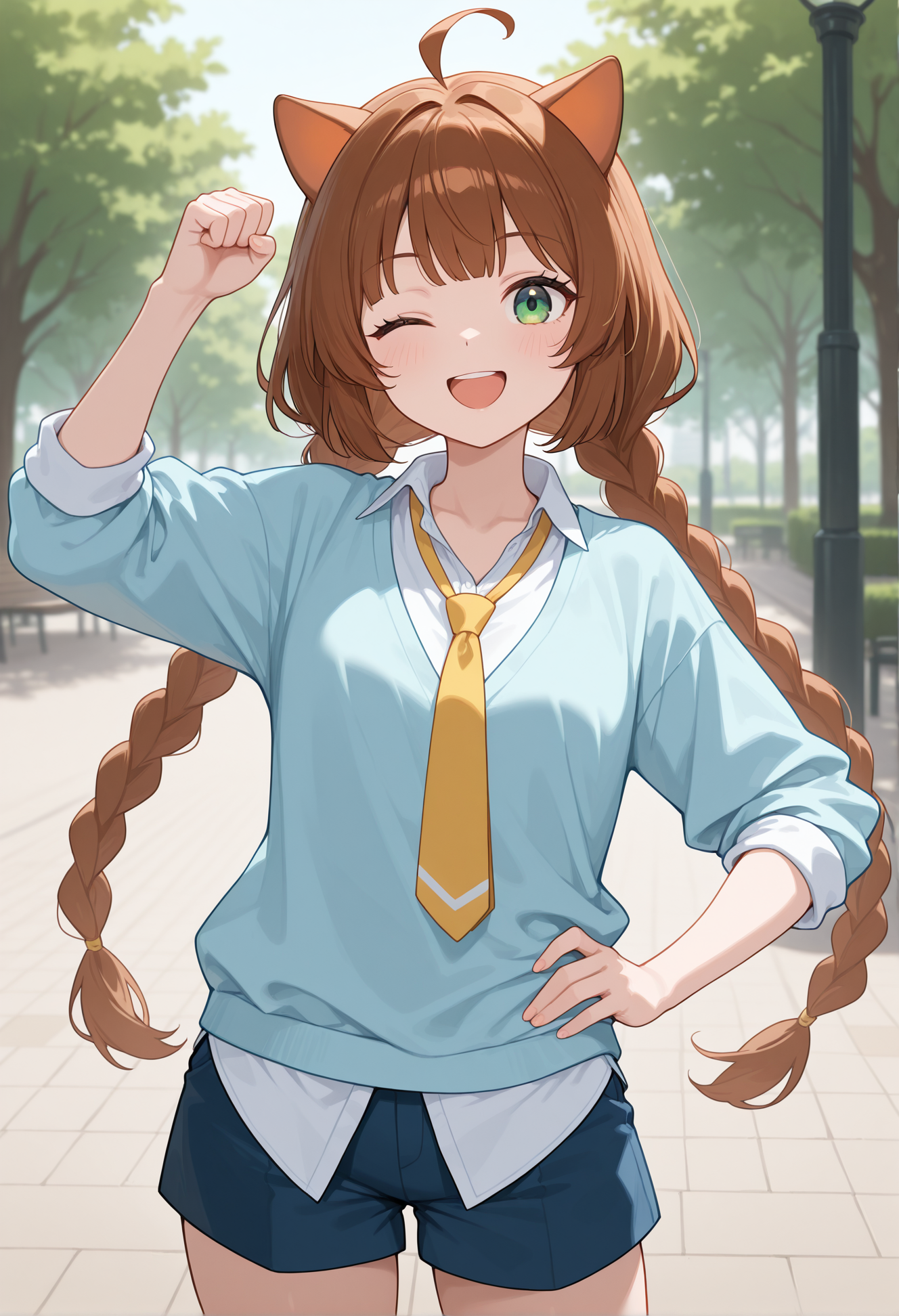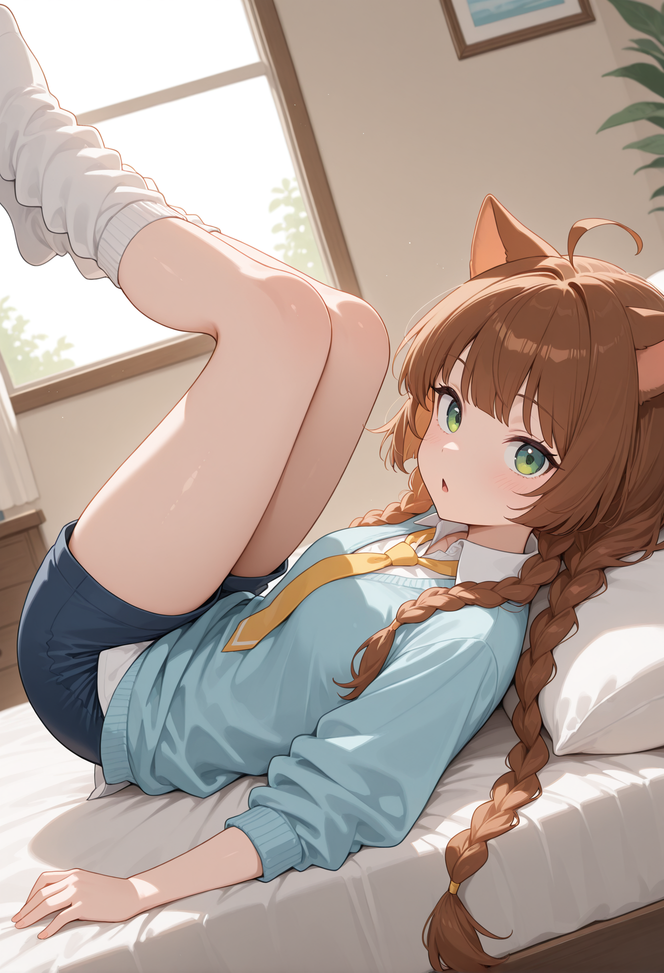 green eyes,brown hair,twin braids,long hair,ahoge,animal ears