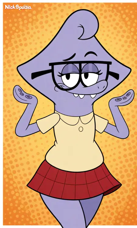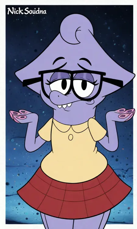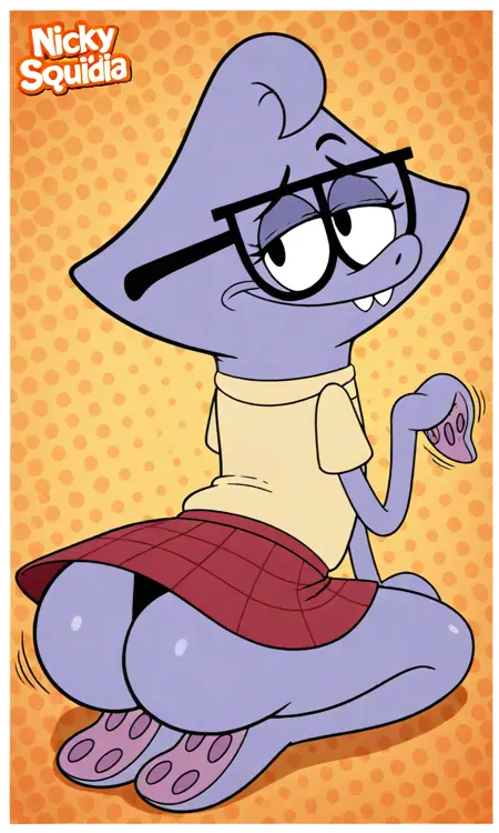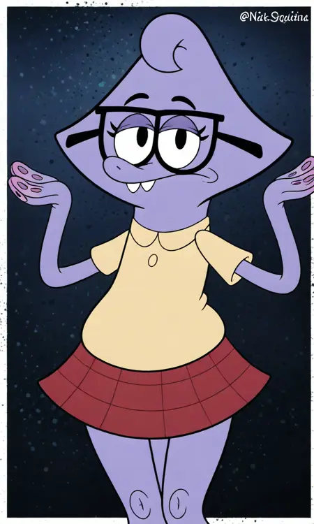 태그: nick_squidina, 오징어, 보라색 피부, 검은 눈, 안경, 촉수, 네 다리, 노란 셔츠, 빨간 치마