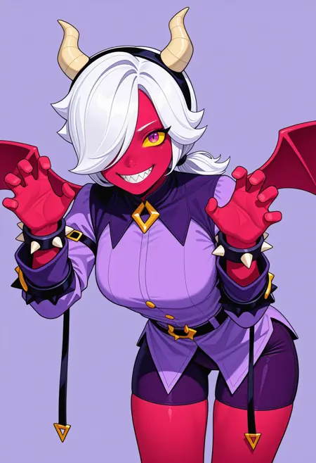 トリクシー: cltttrx、赤い肌、赤い翼、悪魔の翼、尖った歯、白い髪、片目に髪をかけた、低いポニーテール、黒いヘアバンド、悪魔の角、紫の目、黄色の白目、ツノ、紫のシャツ、裾を出しているシャツ、長袖、袖ガーター、スパイク付きブレスレット、紫のショートパンツ、自転車用ショートパンツ