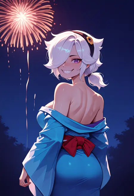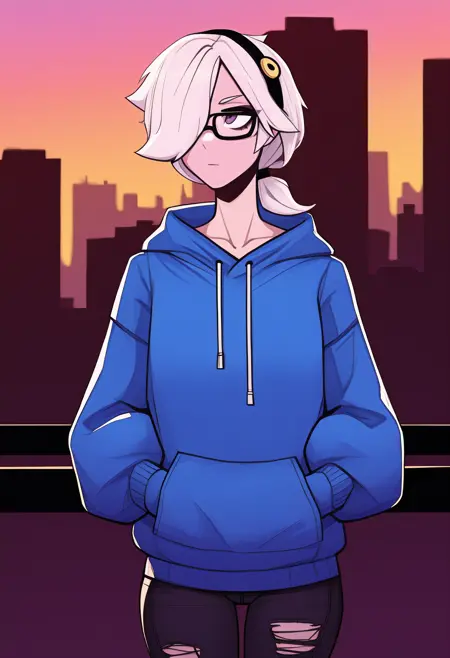 デフォルトの服装: clttdef, 尖った歯、白い髪、片目に髪をかけた、低いポニーテール、黒いヘアバンド、赤いベスト、青いシャツ、襟付きシャツ、長袖、袖ガーター、紫のズボン