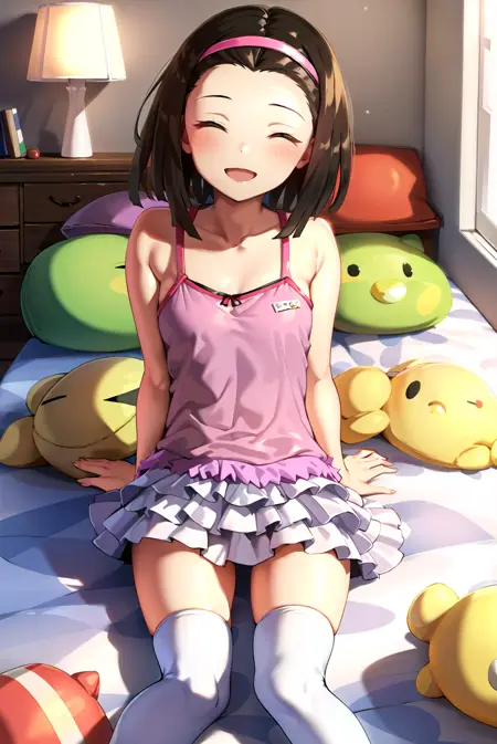 For her casual indoor outfit use frilled skirt, pink camisole, white thighhighs, cardigan, open cardigan.