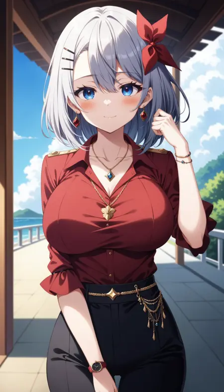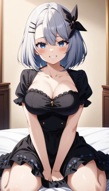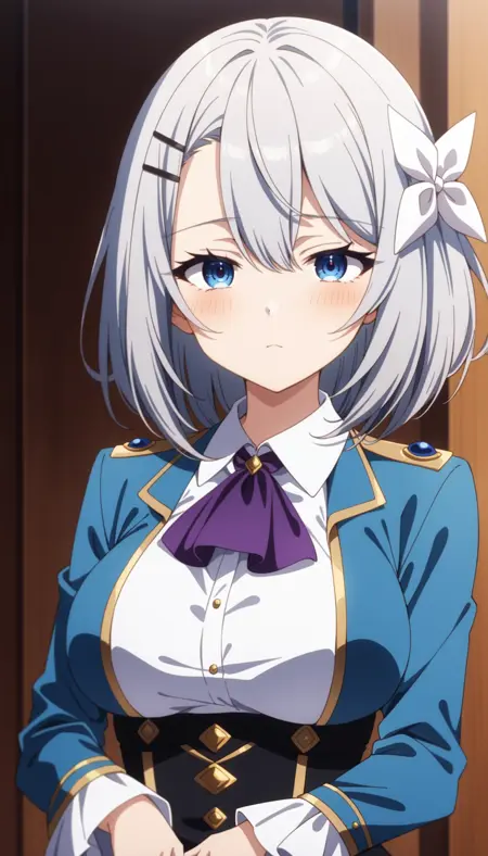 SakunaMemoir, grey hair, bangs, hair between eyes, medium hair, blue eyes, hair ornament, hairclip, hair bow