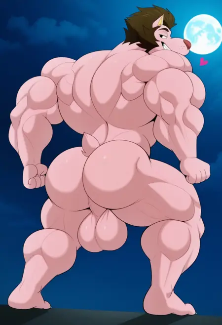강화 프롬프트: "꼬리, 검은 눈, 마젠타 털, 단발, 갈색 머리, 큰 코, 근육질, 성인 남성, bara, 큰 가슴근, 가슴근 크기 차이"
