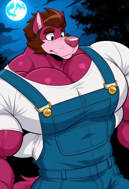 强化提示:"尾巴,黑眼睛,粉紫色毛发,短发,棕色头发,大鼻子,肌肉发达,成熟男性,bara,宽大胸肌,胸肌大小不一"