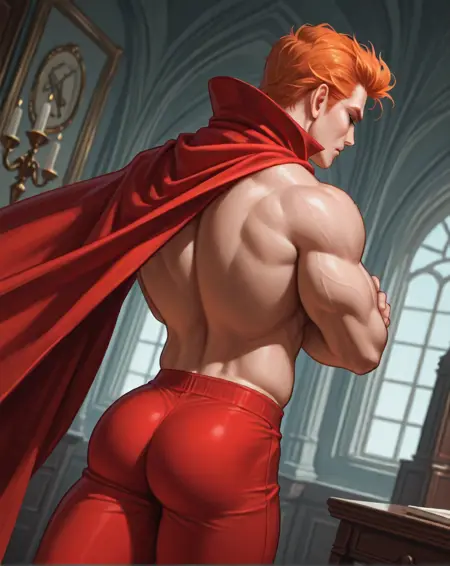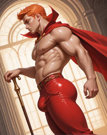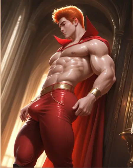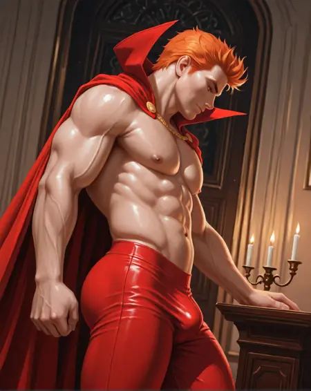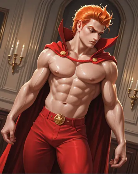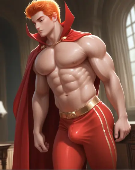 (赤いスパッツ、オレンジ色の髪、赤いマント)などの追加プロンプトを加えると、画像の出来がよくなります。彼の胸には通常、五芒星が描かれていますが、私がそのシンボルをプロンプトに加えても、いつもうまく表示されないため、胸に五芒星を含めた画像の生成は試みていません。古いコミックスでは、彼はヴィクトリア時代の貴族風の短髪で、前髪の両側が短い角のように形づくられています。後のコミックスでは、彼の髪は長くなり、ある時期にはスティーブン・セーガルのようなポニーテール風の長髪をしていたこともあります。
