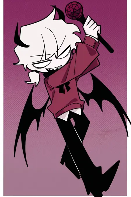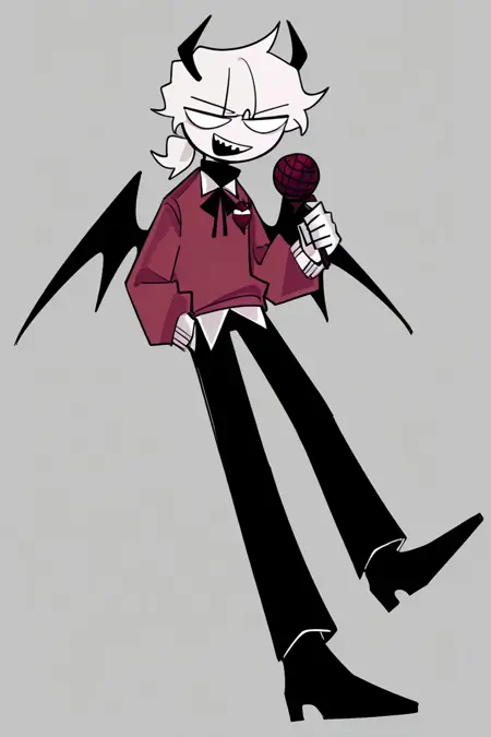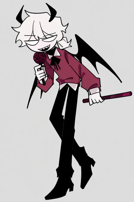 SeleverFNFM, 1boy, demon, white skin, messy white hair, one ponytail, white eyes, sharp teeth, devil horns, devil Wing, rose-colored sweater, black pants, black shoes, stickman stick figure,