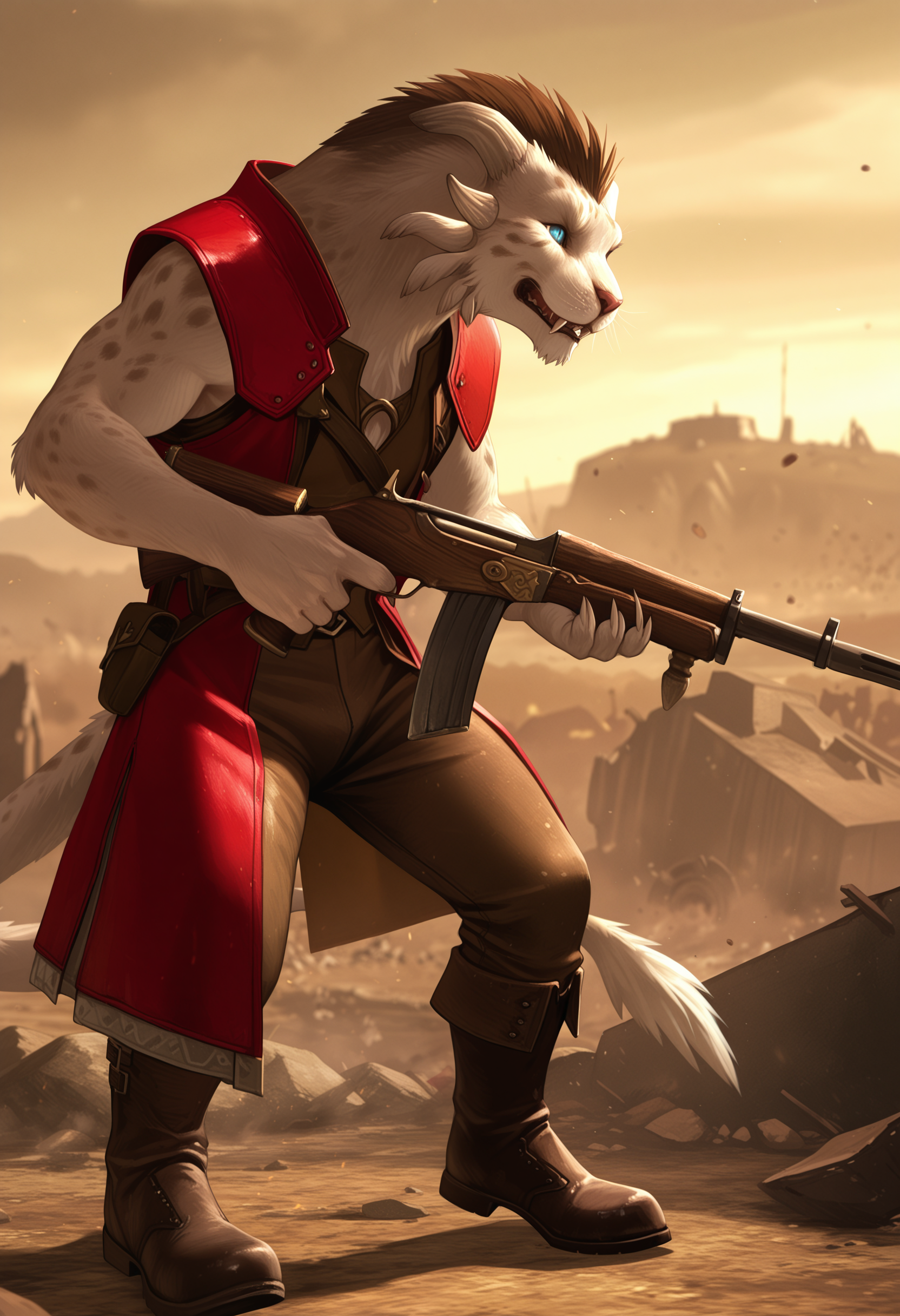 red sleeveless coat, brown pants, open toed boots, brown shirt,