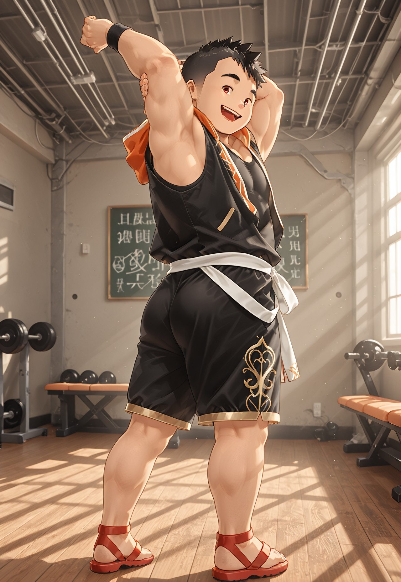 naked, purple sports jacket, open jacket, white mawashi belt, showing off torso,