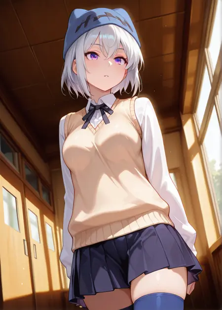 athenaxd, 1girl, animal hat, hat, medium hair, grey hair, purple eyes,