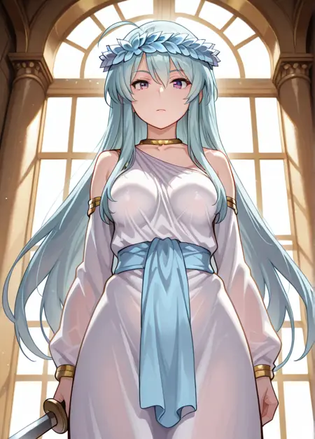 athenaxd, 1girl, long hair, purple eyes, head wreath, grey hair,