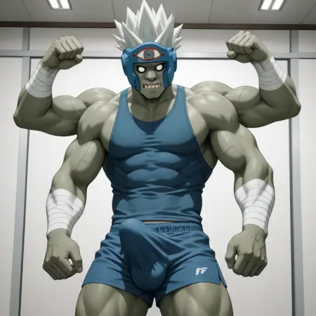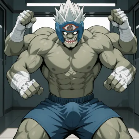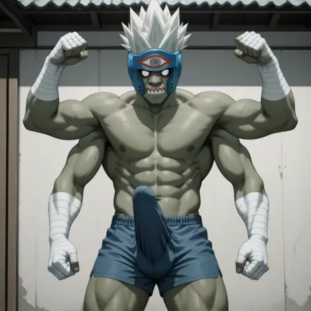 트리거 단어: f1ghtdj1nn, 색상이 있는 피부, 녹색 피부, 흰색 머리카락, 가시 같은 머리카락, 추가 팔